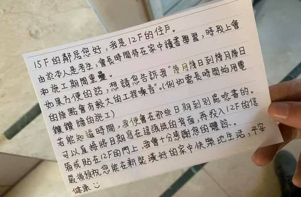 家中施工遭鄰居考生貼紙條 本以為來抱怨 一看內容讚嘆 千金難買好鄰居 太報 Line Today